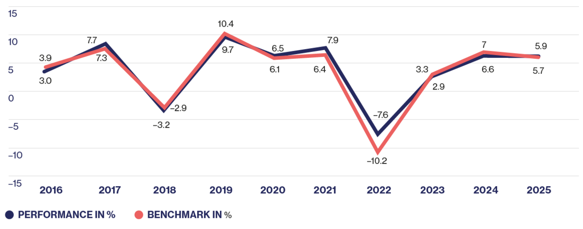 Despite this easing, the Swiss franc strengthened significantly against the major currencies over the course of the year, driven by capital inflows and its role as a safe haven. Overall, global growth remained solid. The S&P 500 rose by around 15%, the European STOXX 600 by 9%, the MSCI Emerging Markets by 12% and the TOPIX by 10%. Yields on 10-year US government bonds stabilised at around 4%, while corporate bonds benefited from tighter credit spreads. Despite geopolitical tensions, 2025 proved to be a year of resilience, supported by expansionary monetary policy and solid corporate momentum.