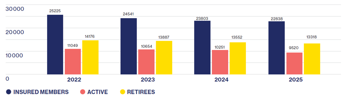 On 31 December 2025 there were 9 520 (previous year: 10 251) actively insured members compared with 13 318 (previous year: 13 552) retirees, of whom 8 487 had reached retirement age, 260 were drawing a disability pension, and 4 067 were drawing a widow(er)’s pension. Orphans’ and children’s pensions accounted for a further 504 current pensions. The average current pension income amounted to CHF 39 902 (previous year: CHF 40 092.
